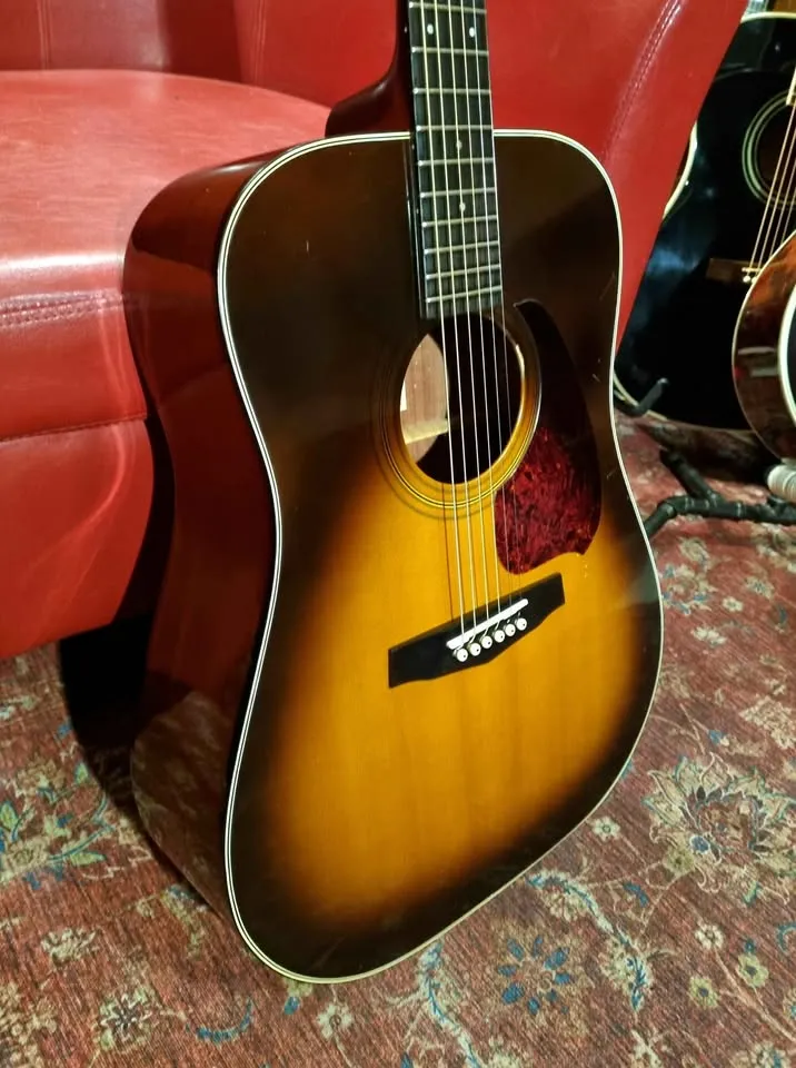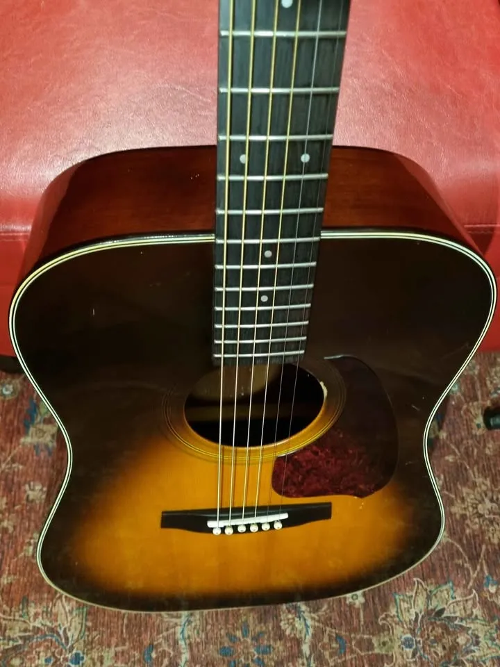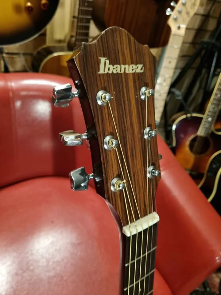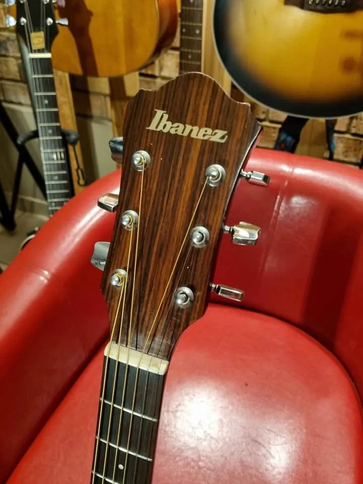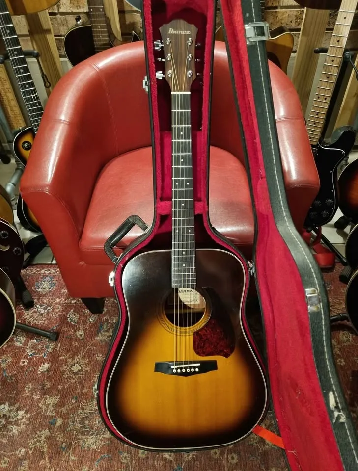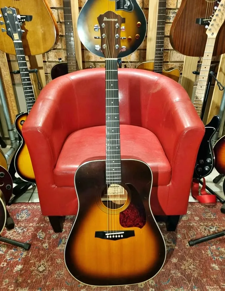Beautiful vintage sunburst Ibanez V300 guitar. Lovely big bold sound, even though it doesn’t have a solid top, the wood used from that era and area was top quality. Nice chunky neck, stood the test of time at 42 years old and still going strong, with proper care, this guitar will serve you another 42 years with a smile.