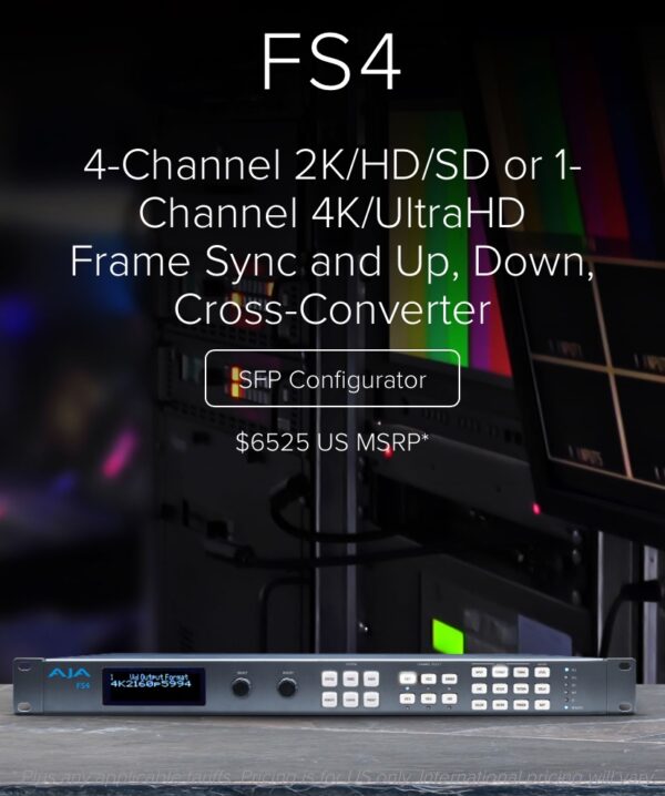 FS4 is a 4-channel 2K/HD/SD or 1-channel 4K/UltraHD frame synchronizer and up, down, cross-converter, and so much more. This combination frame synchronizer and converter offers incredible versatility and connectivity in a sleek 1RU frame for all your 4K/UltraHD and 2K/HD/SD conversion needs. FS4 offers a wide range of connectivity for both video and audio, including optional SFPs for single link 12G-SDI connectivity. For HDR workflows, the FS4 supports automatic or configurable HDR metadata generation for the SDI output VPID and HDMI output HDR Infoframe.