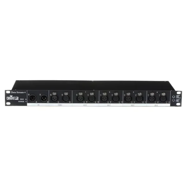 A compact 1U optical DMX splitter with 1 Thru and 4 Out ports