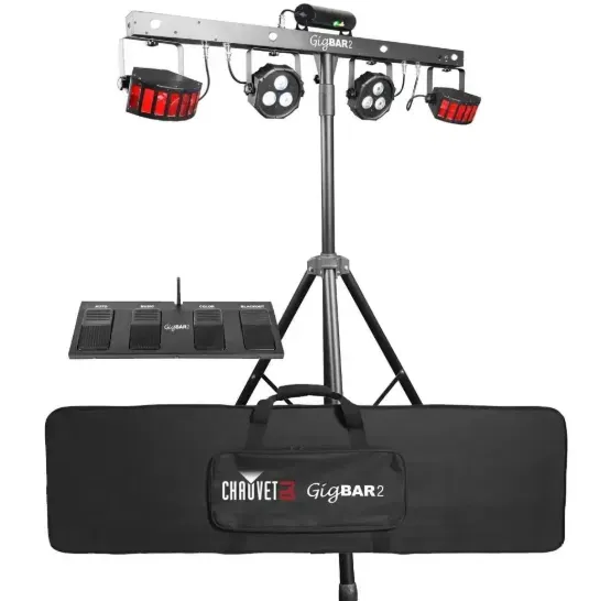 GigBAR 2 is the ultimate pack-n-go 4-in-1 lighting system including UV in its wash lights, includes a pair of LED derbies, LED pars, a laser, and strobe effect all mounted on one bar, includes Tripod stand 2,5m