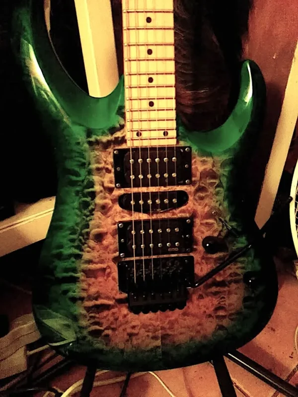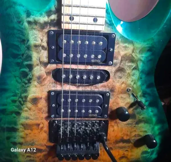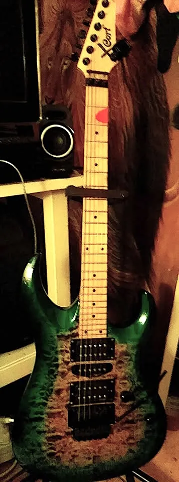 State of Art Quilted Maple Top Cort X – 11 with Mahogany Body and Maple Neck plus EMG Passive Pickups, coil tap and Floyd Rose Trem System. Awesome Ultra versatile Axe!