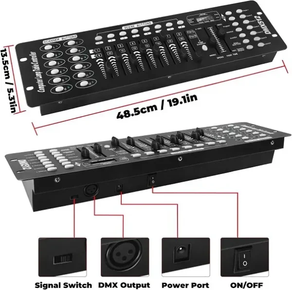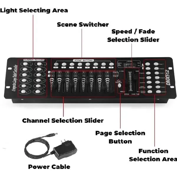 Our DMX Controller can control up to 12 intelligent fixtures, each with 16 channels, for a total of 192 channels, and it can also control up to 240 scenes.The DMX Console is perfect for small parties as well as DJs -The DMX Lighting Controller comes with a 3-pin cable, which allows you to easily connect other 3-pin stage equipment such as fog jet machines, fog machines, par lights, wall washers, moving heads, front lights, cob light, black light and more -Perfect for weddings, DJs, nightclubs, concerts, festivals, parties etc -Our DMX Controller is perfect for beginners.The DMX contains 7 sections, light selection area, scene switcher, channel selector lever, LED display, page selector buttons, speed/time selector lever, function selection area -Very easy to operate