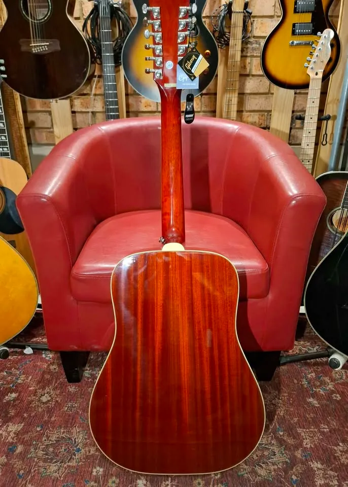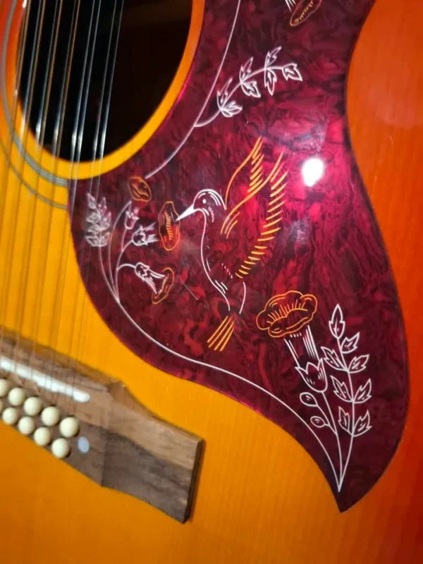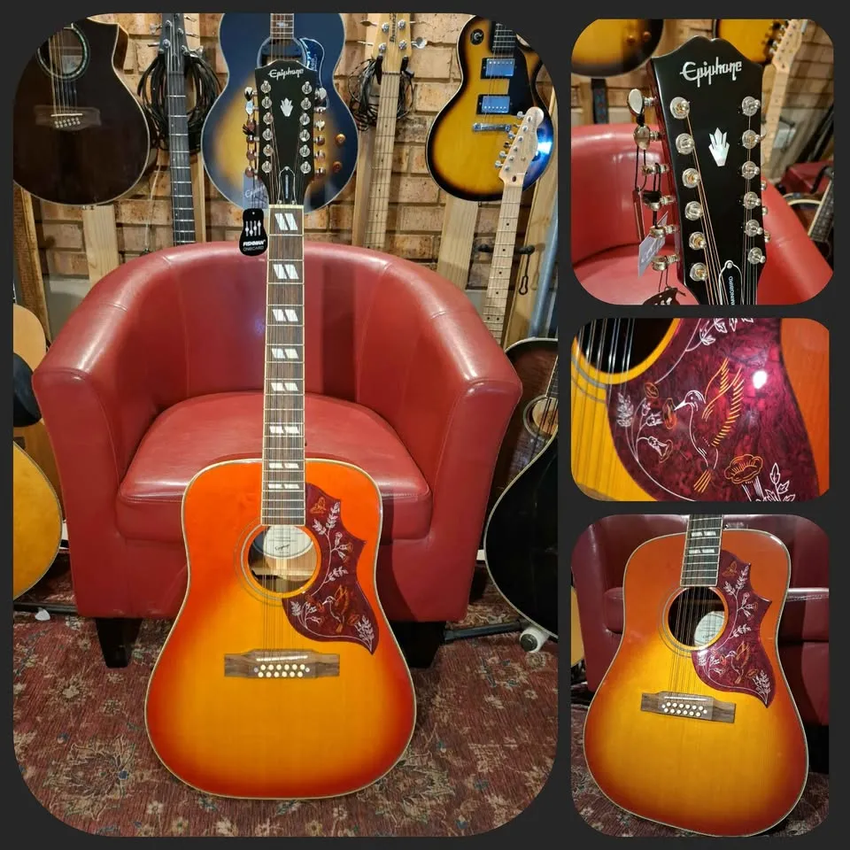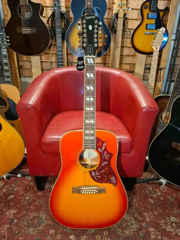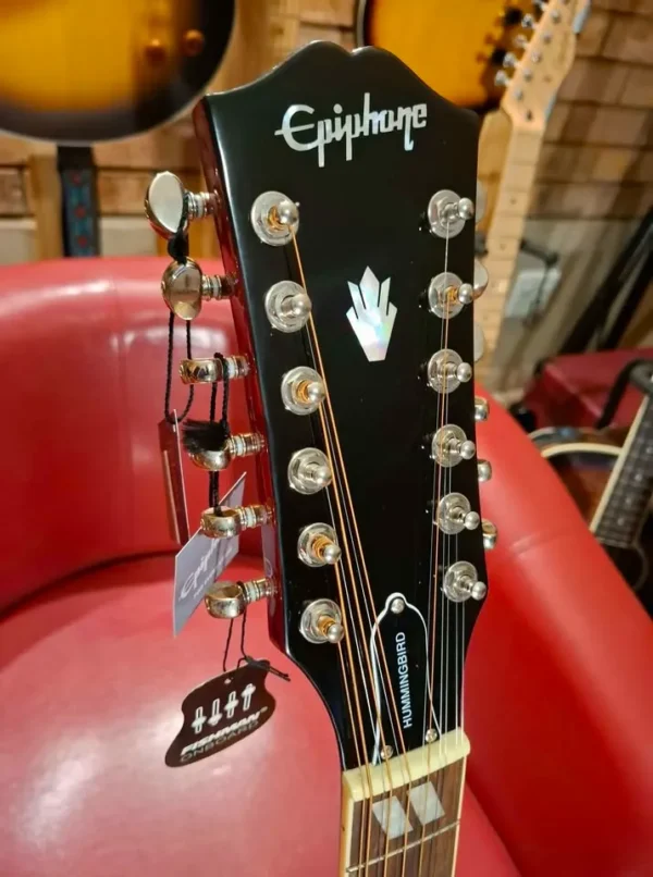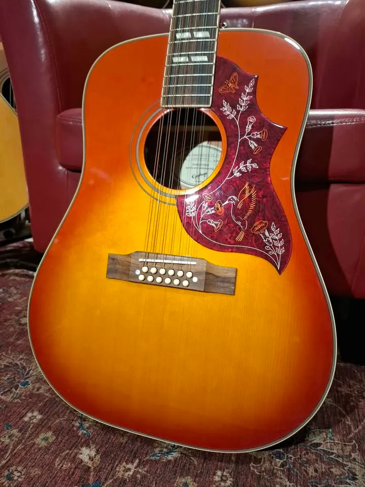Epiphone Hummingbird 12 String, paying homage to the original 1960’s Gibson Hummingbird, but with obvious pickup upgrade, solid top, and Grover 18:1 tuners.