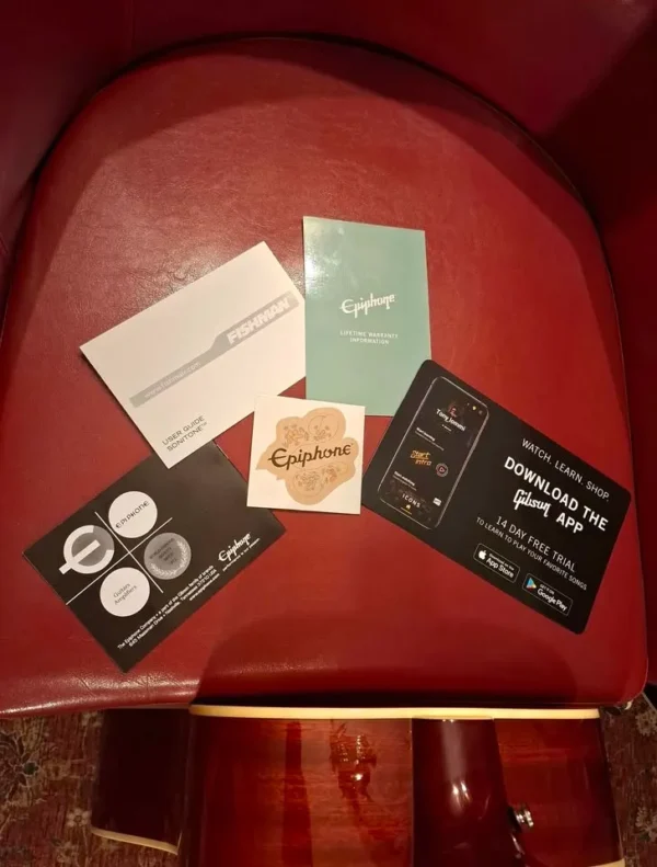 Comes with all the bells and whistles of a new guitar, tags, user manual, and a shortcut to the Gibson guitar studio app.