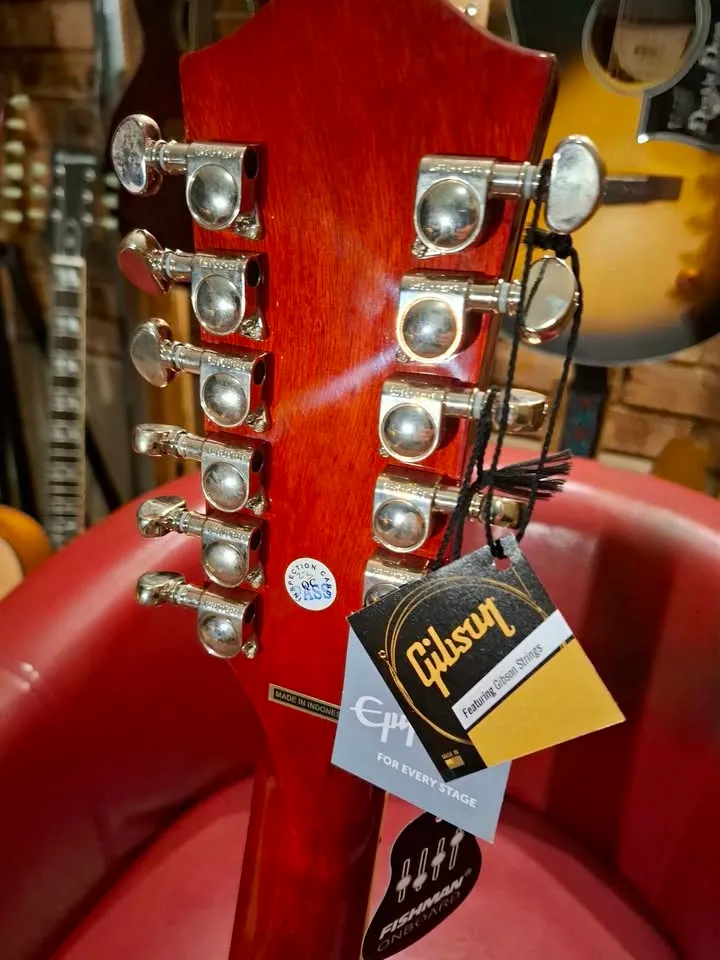 An amazing instrument, beautifully crafted and finished with a cherry burst and an iconic Hummingbird pickguard.