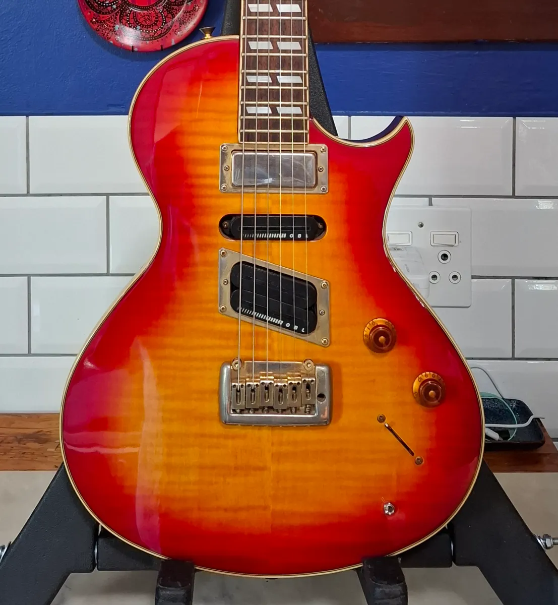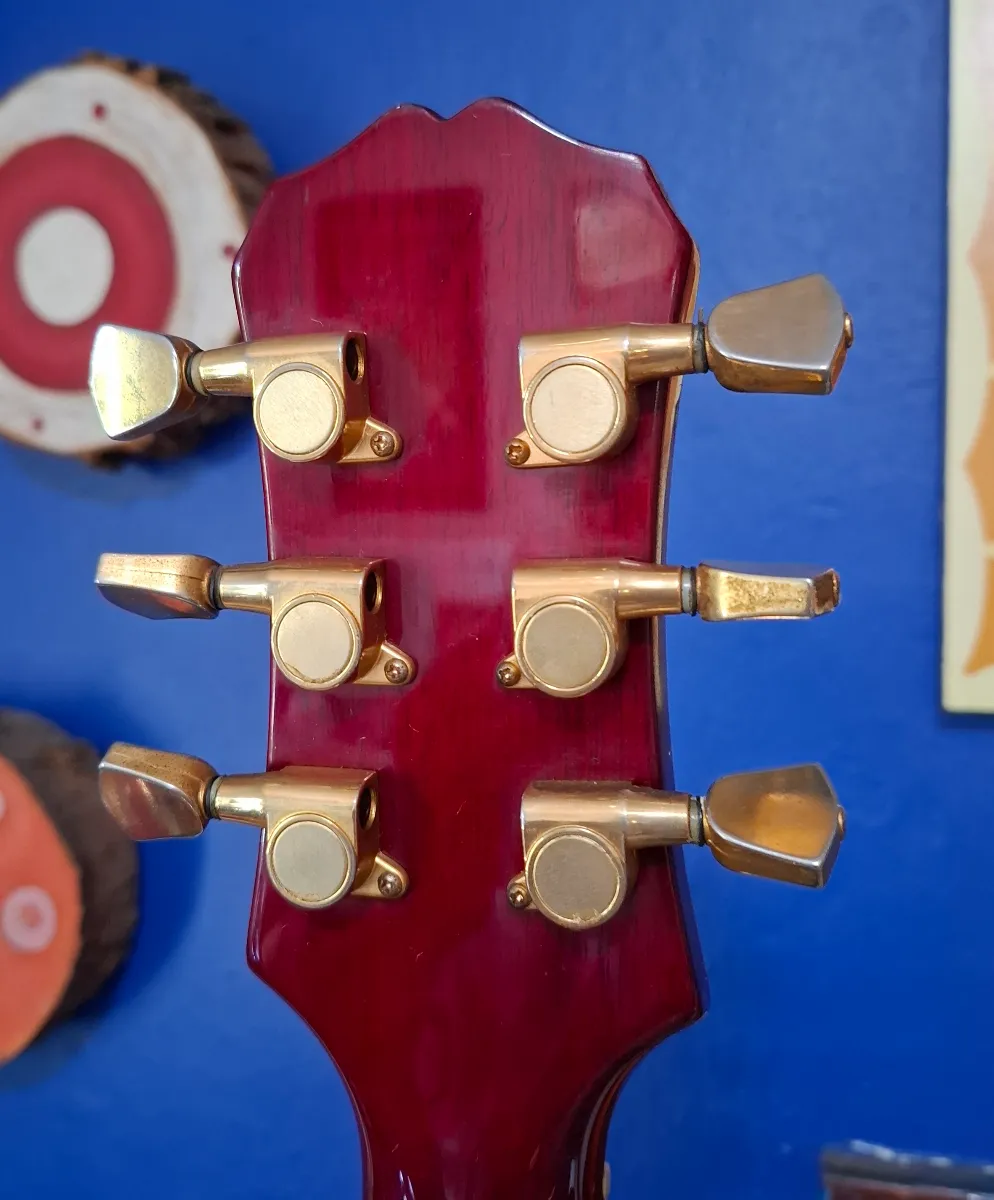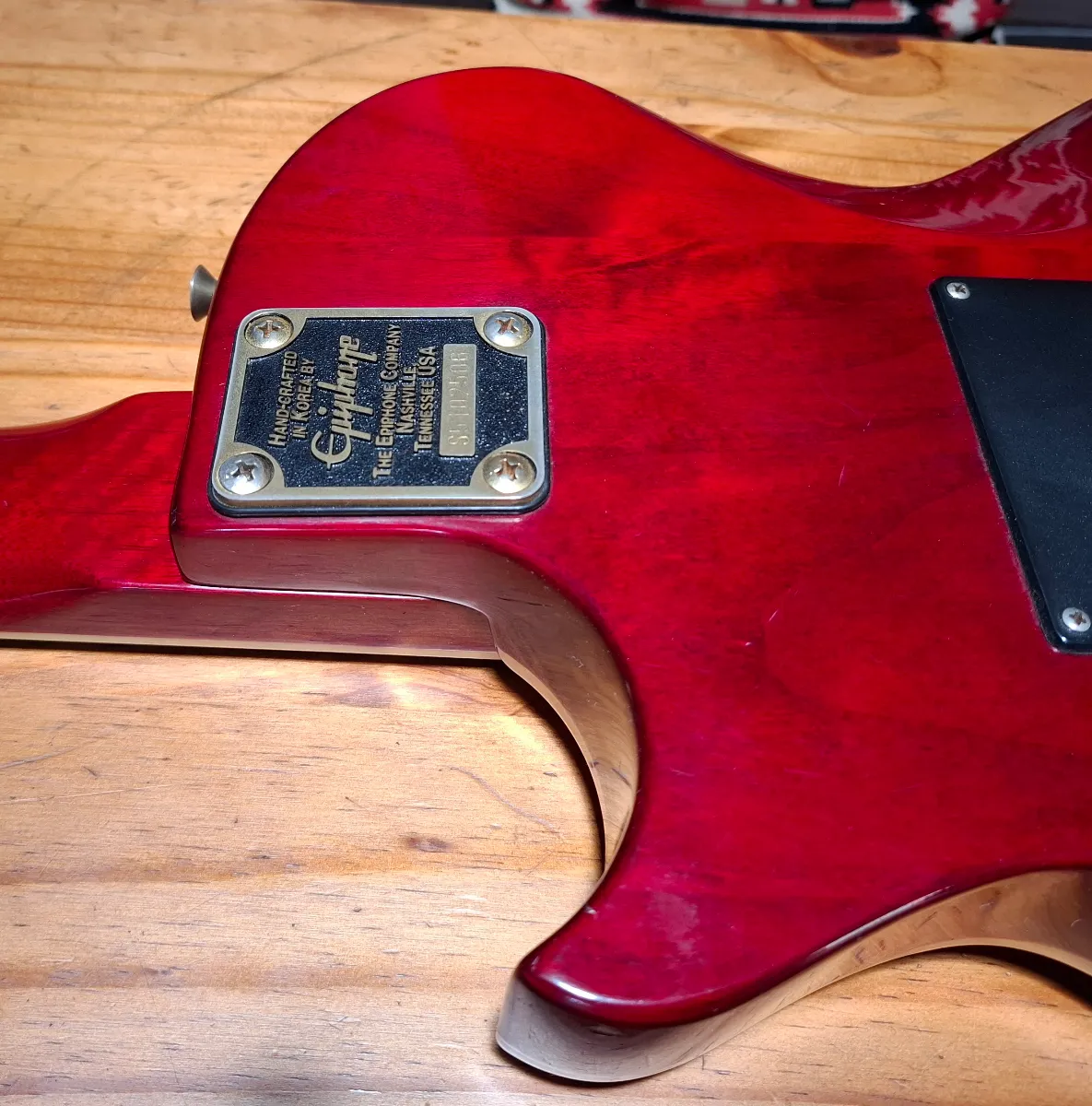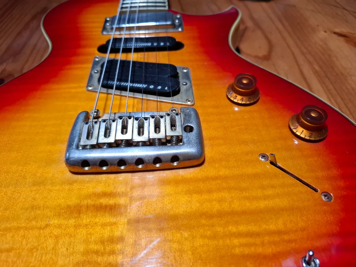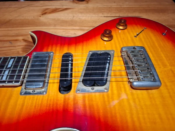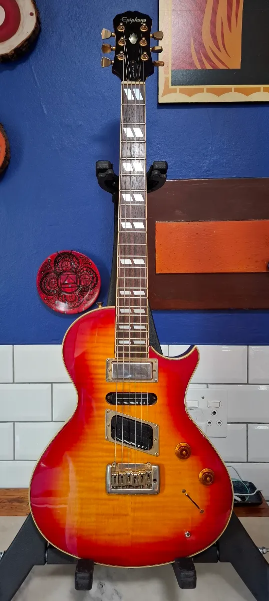 An original edition of Epiphone’s version of the versatile Gibson Nighthawk: manufactured in October 1995 in South Korea. Selling on behalf of a friend who recently lost her husband. He didn’t use it much; has basically been stored. This version has a bolt-on neck and floating bridge. Solid mahogany body, sunburst flame maple top and rosewood fretboard. Unique pickup configuration with a mini-humbucker in the neck, single-coil in the middle and humbucker where it counts.