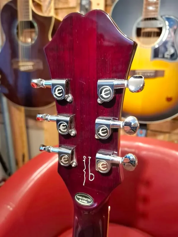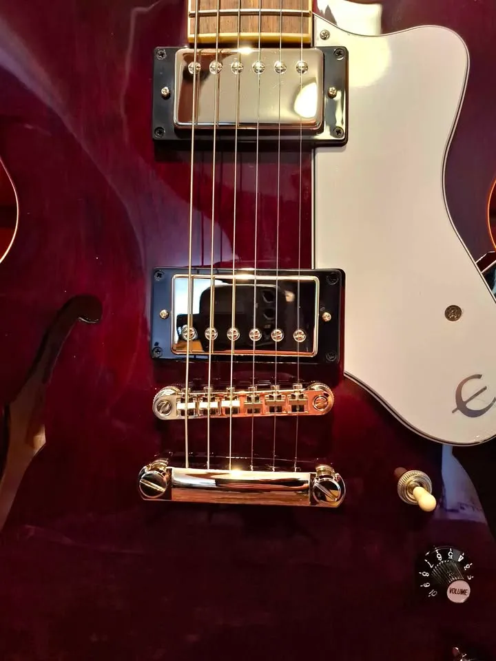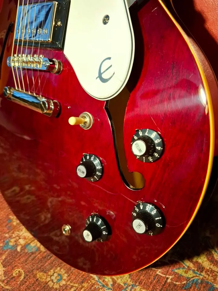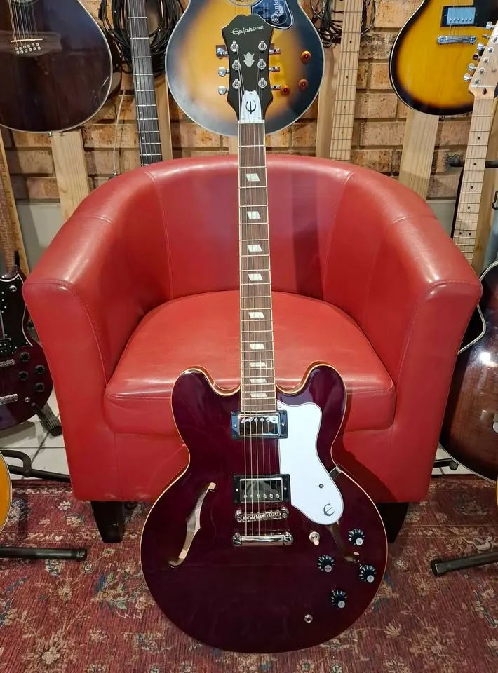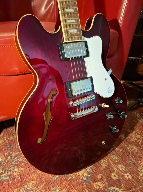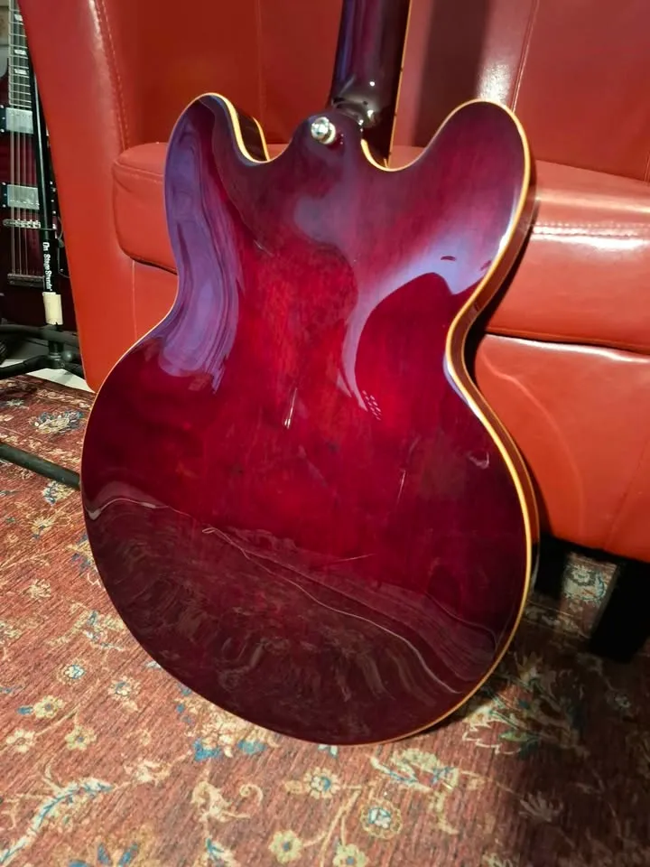 Beautiful deep dark cherry wine red, mother of pearl inlays on fret markers, upgraded with Alnico Classic Pro pickups, better than the normal ES-335. 5 ply layered maple semi hollow body.