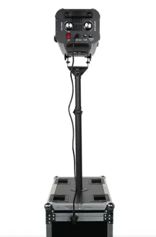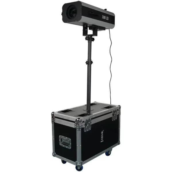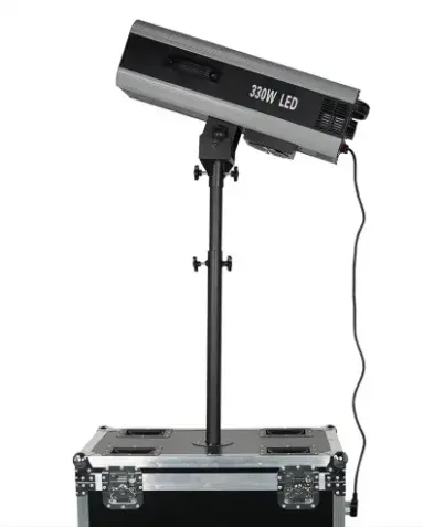 This manual operated follow spot is a professional, high-output lighting fixture designed for precise performer and subject tracking in live events. Fitted with a powerful 330W LED light source, it delivers a strong, focused beam with excellent clarity and consistency. The unit is mounted on a height-adjustable pole fixed directly into a heavy-duty wheeled flight case, allowing fast setup, stable operation, and safe transport. Ideal for venues that need a reliable, operator-controlled spotlight without complex DMX programming.