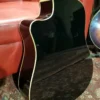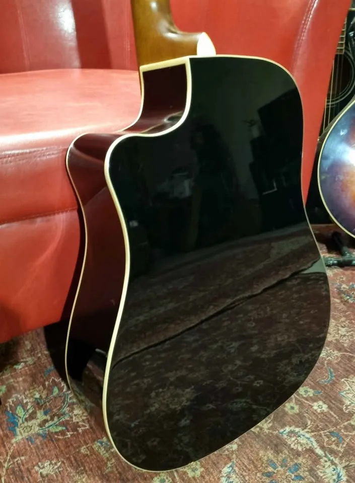 Beautiful piano black, almost mirror like gloss, topped with a 3 ply gold top pickguard. Very beautiful and stylish guitar.