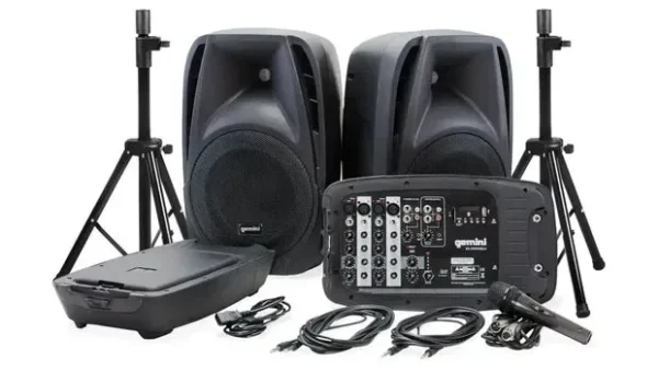 Complete Portable PA System; incl 2 x 10″ Loudspeaker, 1 x Mixer amplifier with Class D Amplification, 2 x Speaker Stands, 1 x Handheld Wired Mic, all cables; Bluetooth Streaming; Phantom Power; SD Card Slot; USB Playback