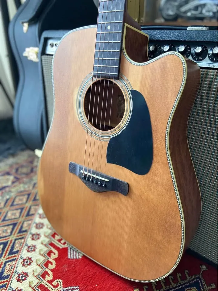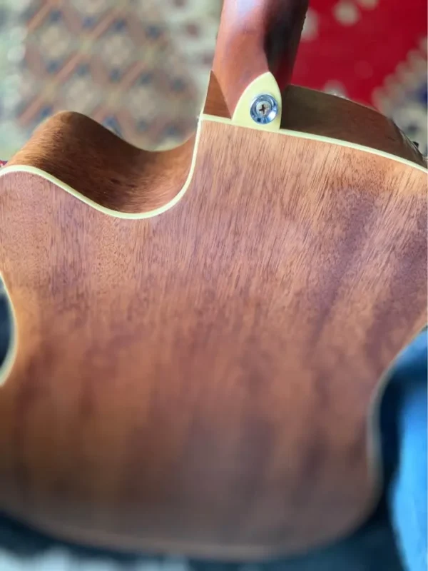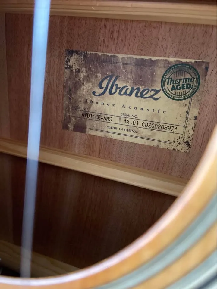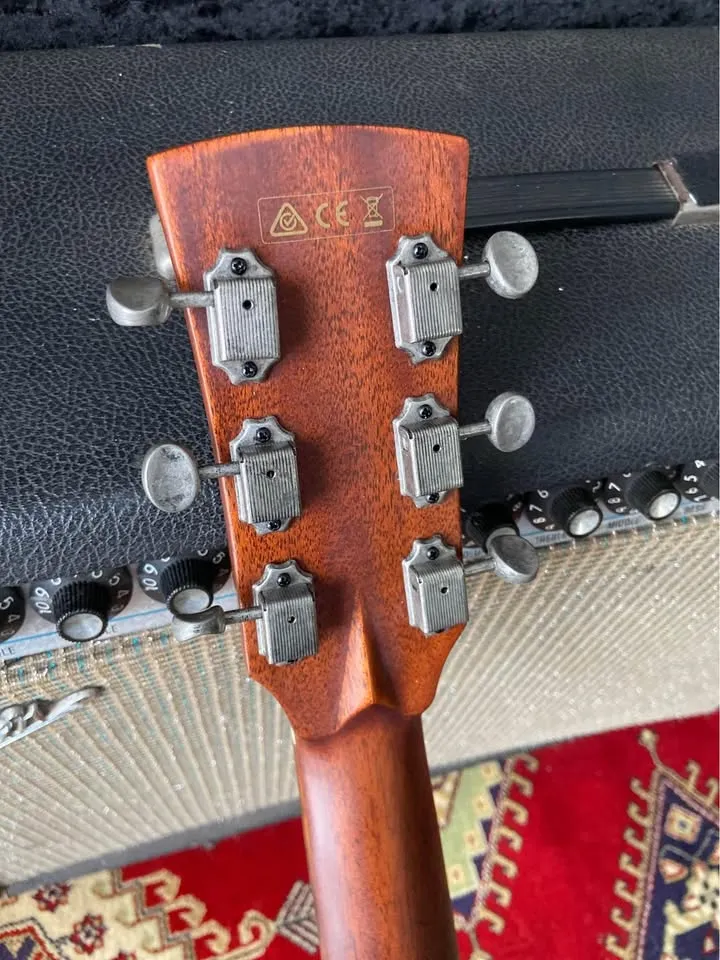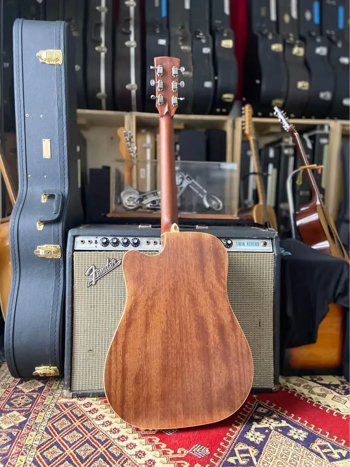 In showroom condition Solid Caucasian spruce top in a semi gloss antique finish Okoume back n sides X bracing Soft V shape neck Fishman sonicore pickup Includes canvas hard case