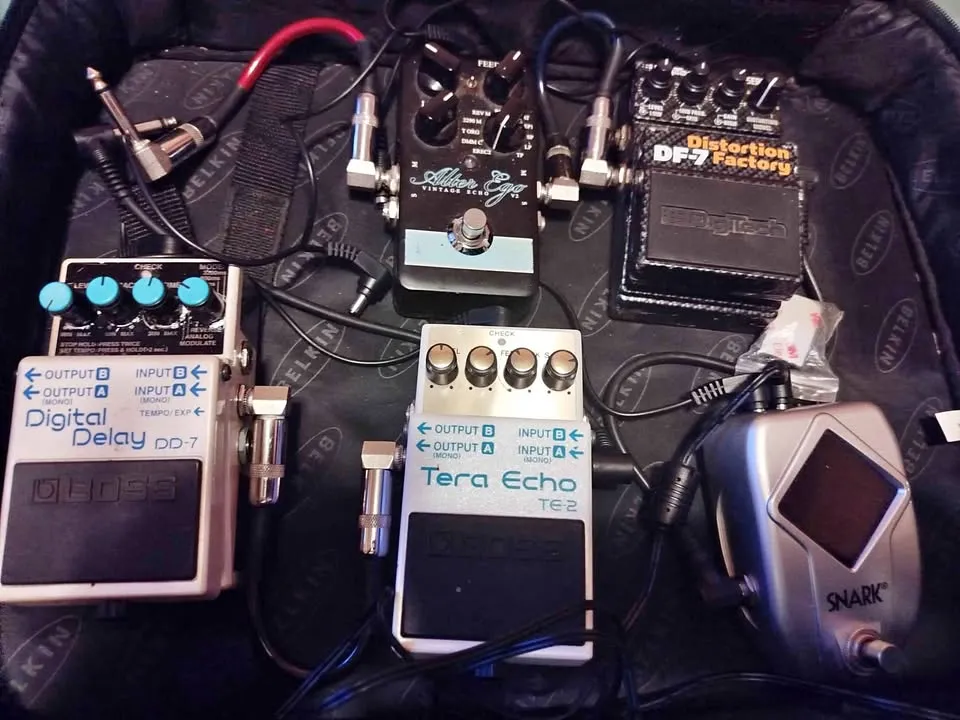 Pro Guitar Effects Pedal Gig Rig. Ultra versatile for gigging or session work, including Boss TE 2 , Digitech DF 7 Distortion Factory with 7 of the finest Distortions ever made, T C Electronic – Alter Ego V2 with 10 of the finest Delays & Modulations plus a programmable custom channel & Snark Tuner/Power Supply. Studio use only.